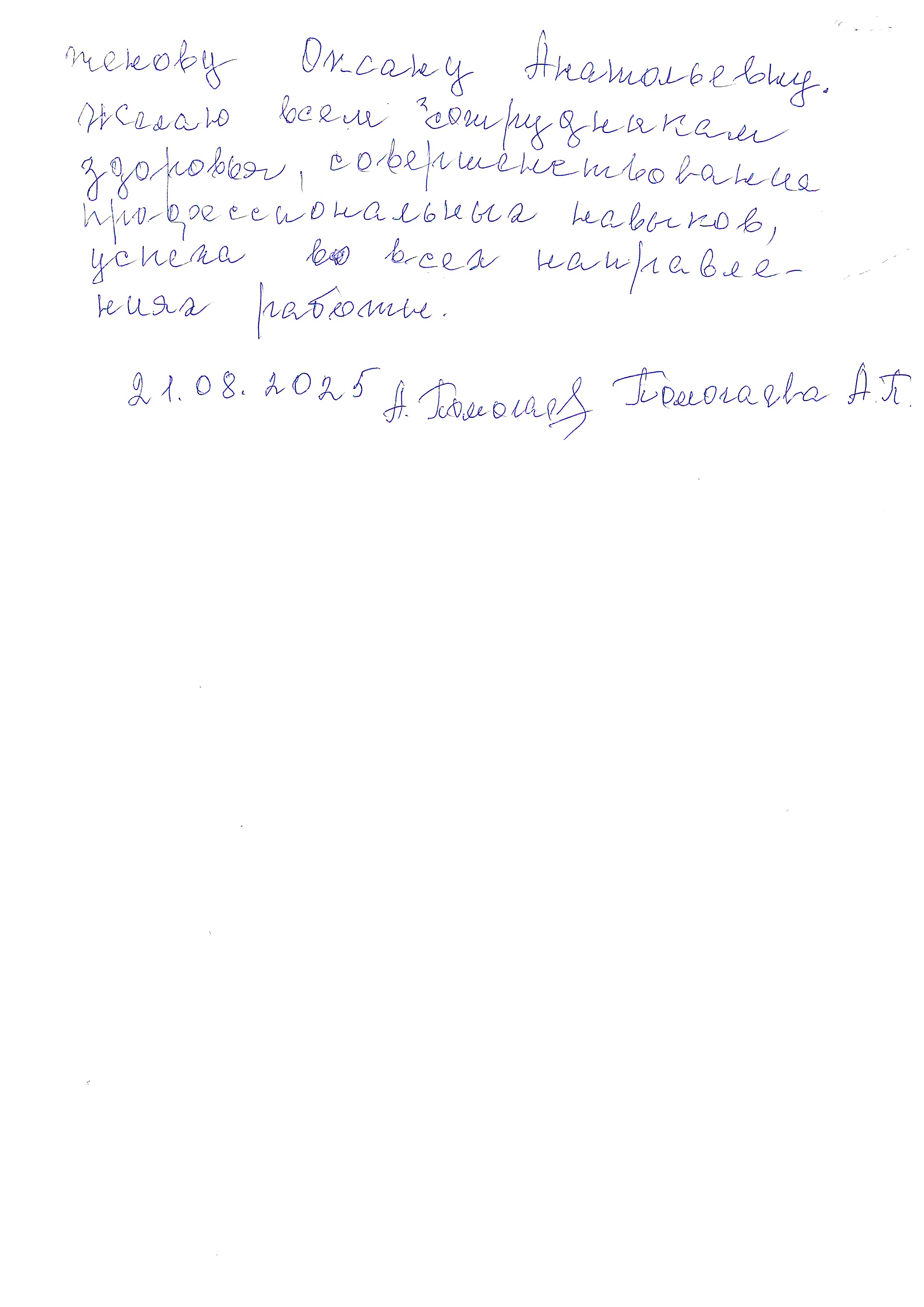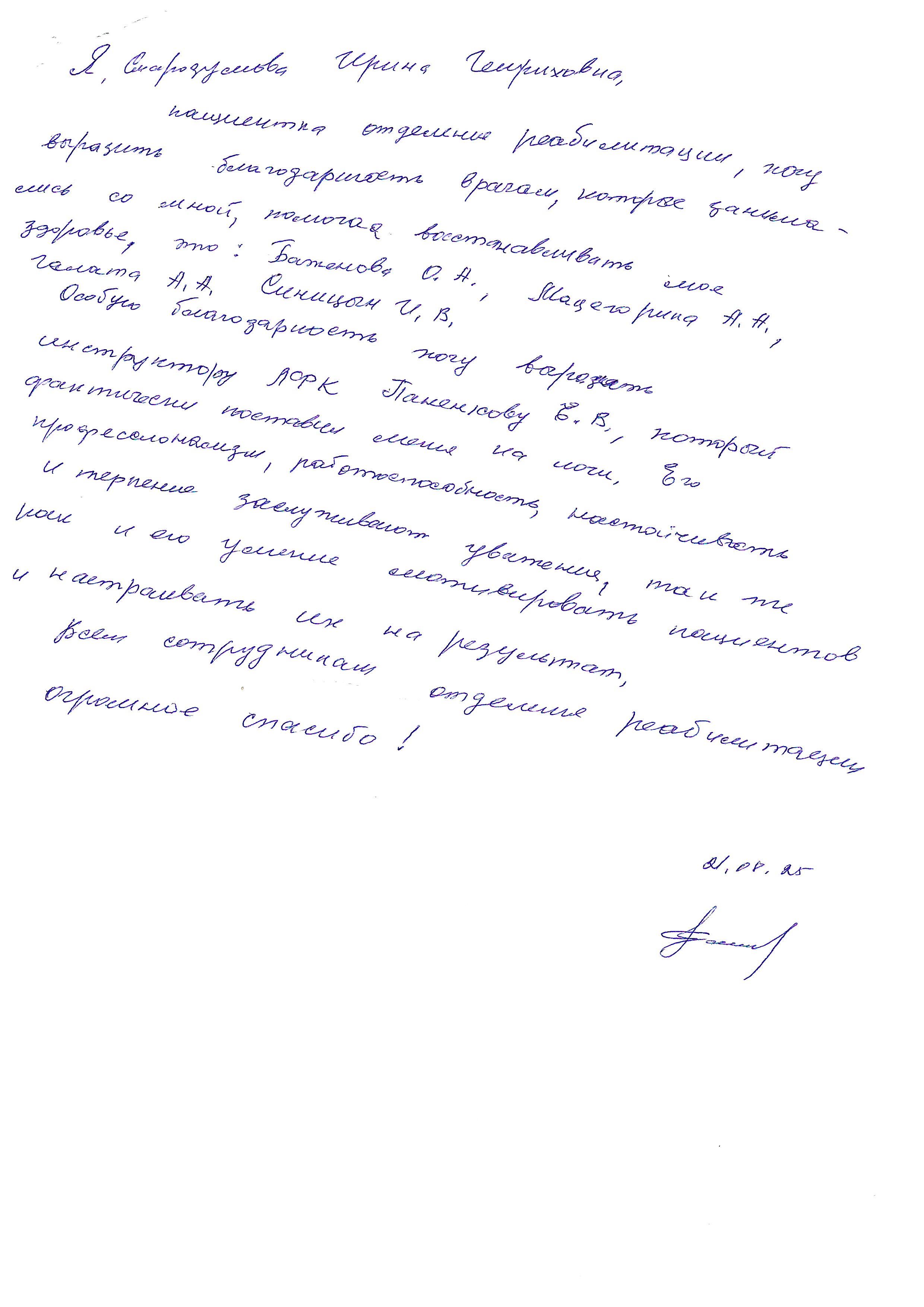 Благодарность30.07.2025 мне делали плановую операцию по удалению паховой грыжи. Хочу выразить благодарность зав, отделением общей хирургии Зуеву А.С. и лечащему врачу Ли С.В. за Ваше мастерство и профессионализм. Отдельную благодарность хотелось бы выразить перевязочной медсестре Румянцевой Н.А. за Ваши золотые руки, поддержку и человеческое отношение. Также выражаю благодарность м/с Алексеевой Г.В., Гордиевских Л. В., Епифановой А. А. и Фроловой Е. В. за Ваш труд и терпение. Благодаря Вашей работе пациенты быстрее выздоравливают. | |